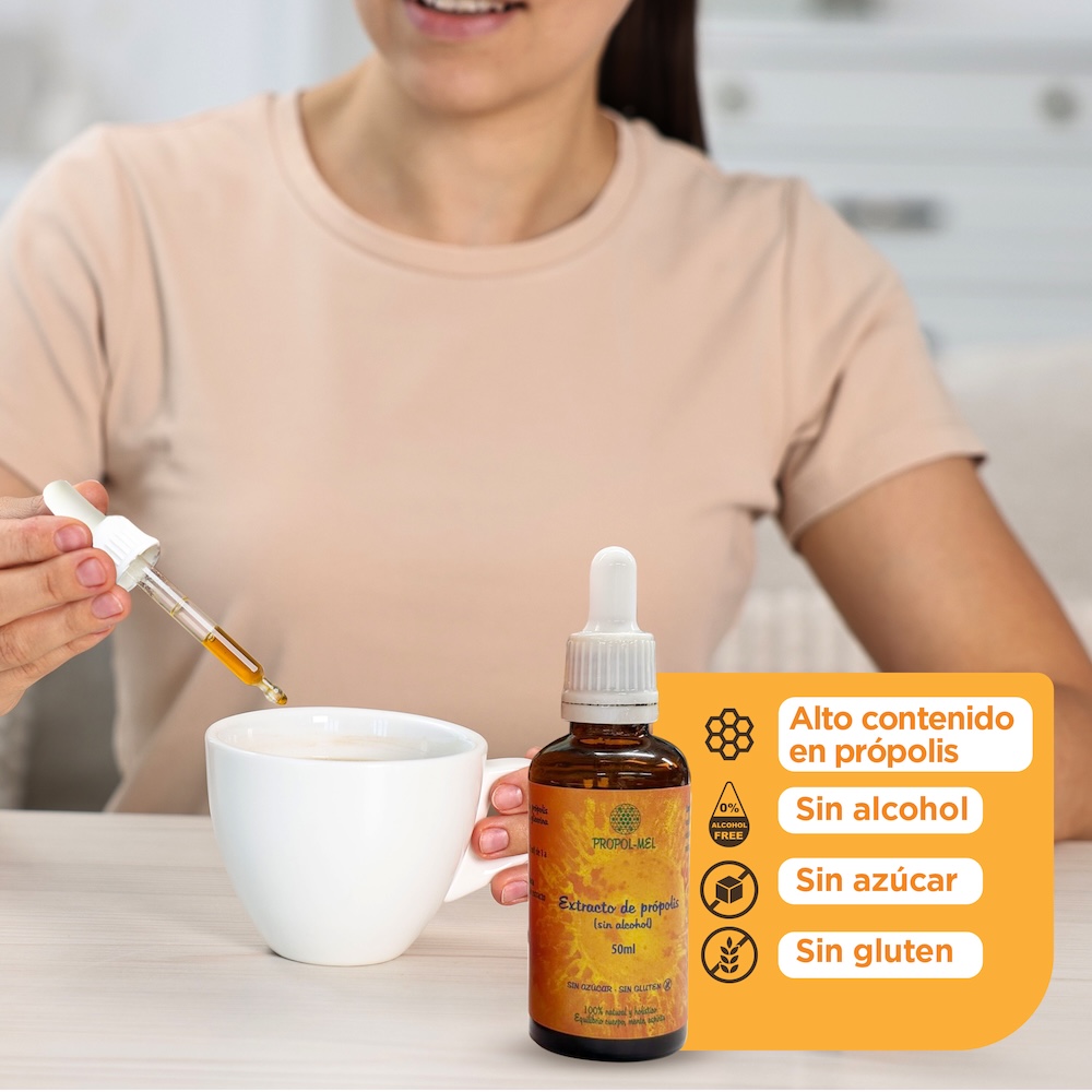 Este extracto, procedente de apicultores comprometidos con el respeto por la colmena y el medio ambiente, es una opción natural y ecológica para la rutina diaria. Su composición incluye extracto concentrado de própolis, agua, glicerina y extracto de stevia, sin gluten ni azúcares añadidos.